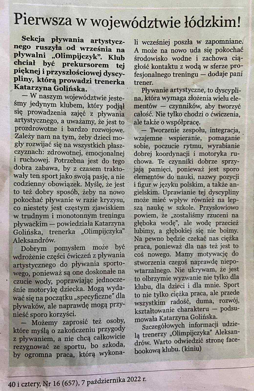 W 2022 roku rozpoczęłam nowy, niezwykle ważny etap w mojej pracy – zostałam trenerką pływania artystycznego w sekcji T.P. Olimpijczyk Aleksandrów Łódzki. Była to pierwsza sekcja tego typu w województwie łódzkim i możliwość tworzenia jej od podstaw traktuję jako ogromny zaszczyt, ale też wyzwanie.