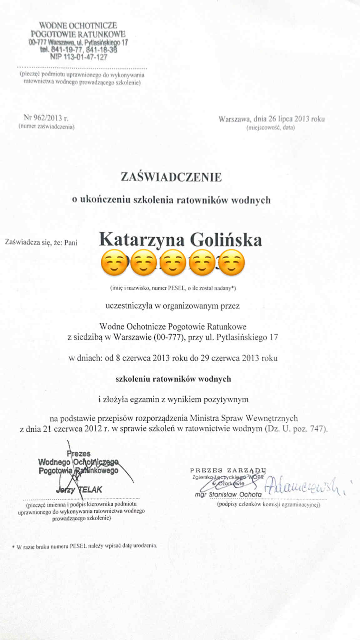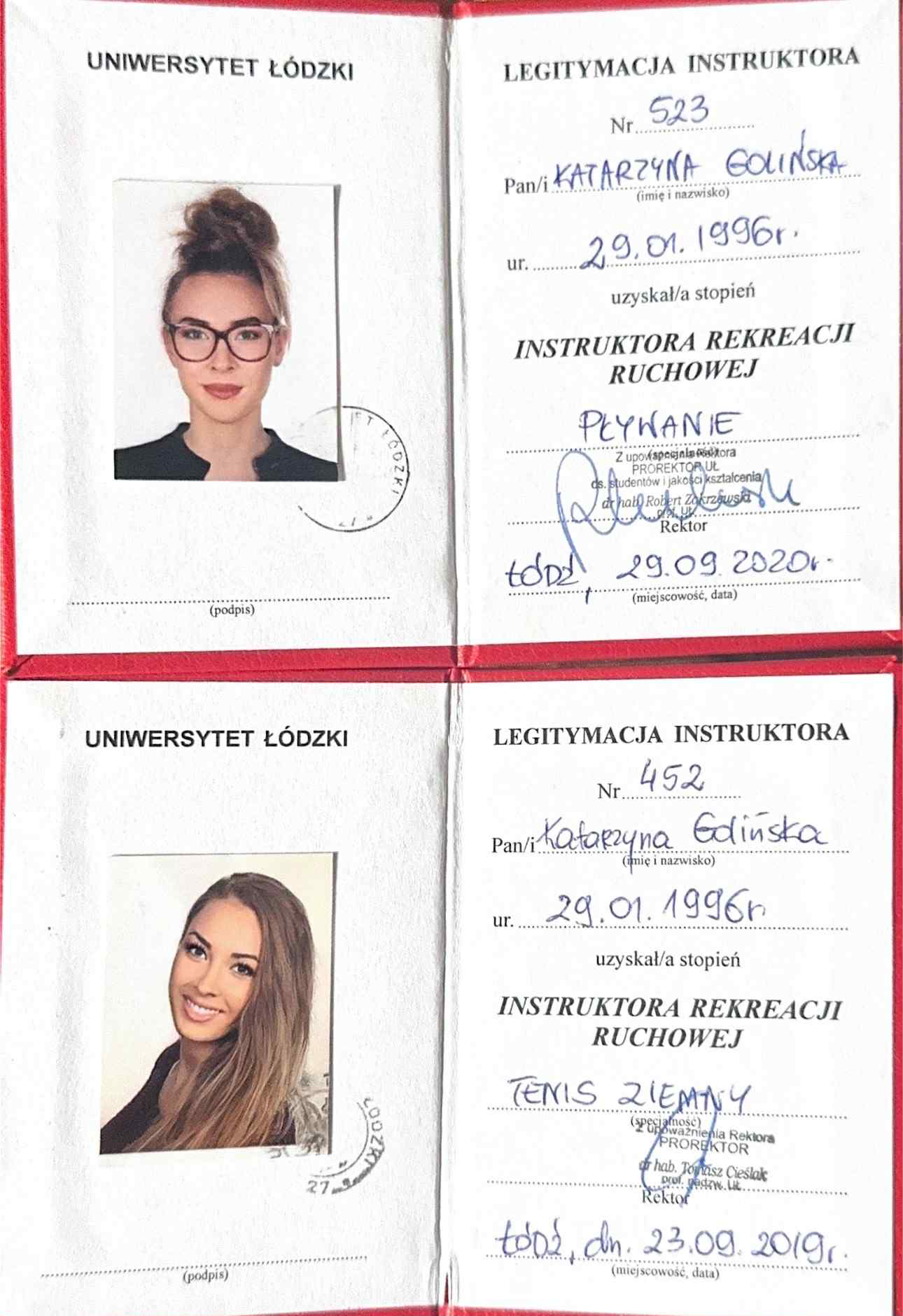 Jestem instruktorką pływania z licencją Polskiego Związku Pływackiego oraz Uniwersytetu Łódzkiego, a także instruktorką rekreacji ruchowej.